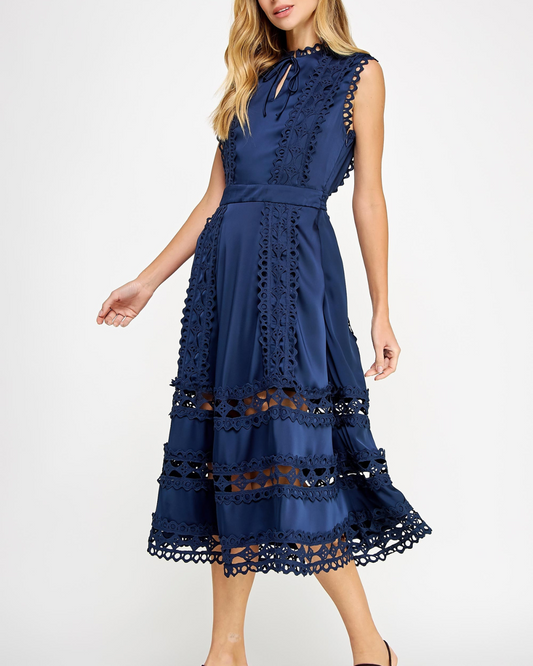 Strut & Bolt Scallop Edge Crochet Trim Satin Midi Dress - D-10336