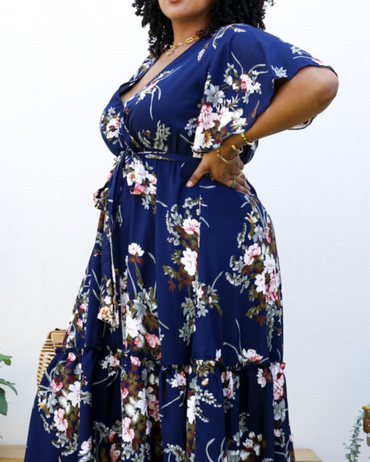 Anna Kaci Plus Size V Neck Floral Print Flowy Navy Maxi Dress - Jn4719