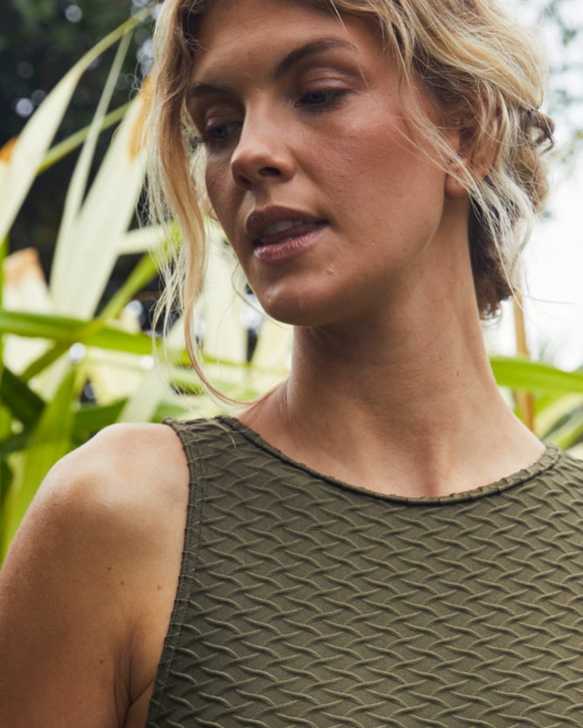 Classic high-neck swimsuit in our signature fabric. Also works great as a summer top.