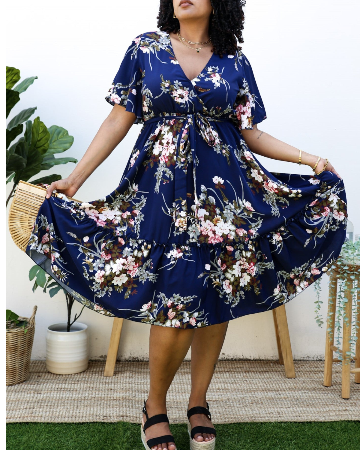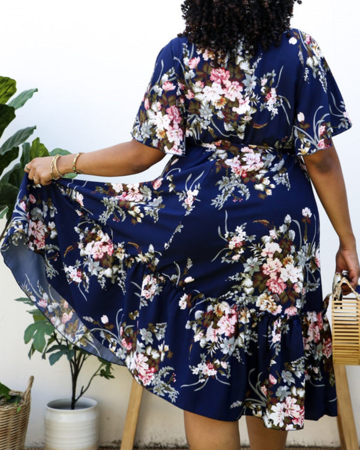 Make a statement with the Anna-Kaci plus size maxi dress. Crafted with a V-neckline and wrap dress style, this navy dress offers a flattering and elegant look. The short sleeves and tied belt waist create a defined silhouette. Adorned with a beautiful floral print, this dress exudes feminine charm. With its flowy skirt and maxi length, it's perfect for both daytime and evening events. Pair it with heels and delicate jewelry for a sophisticated and romantic ensemble.