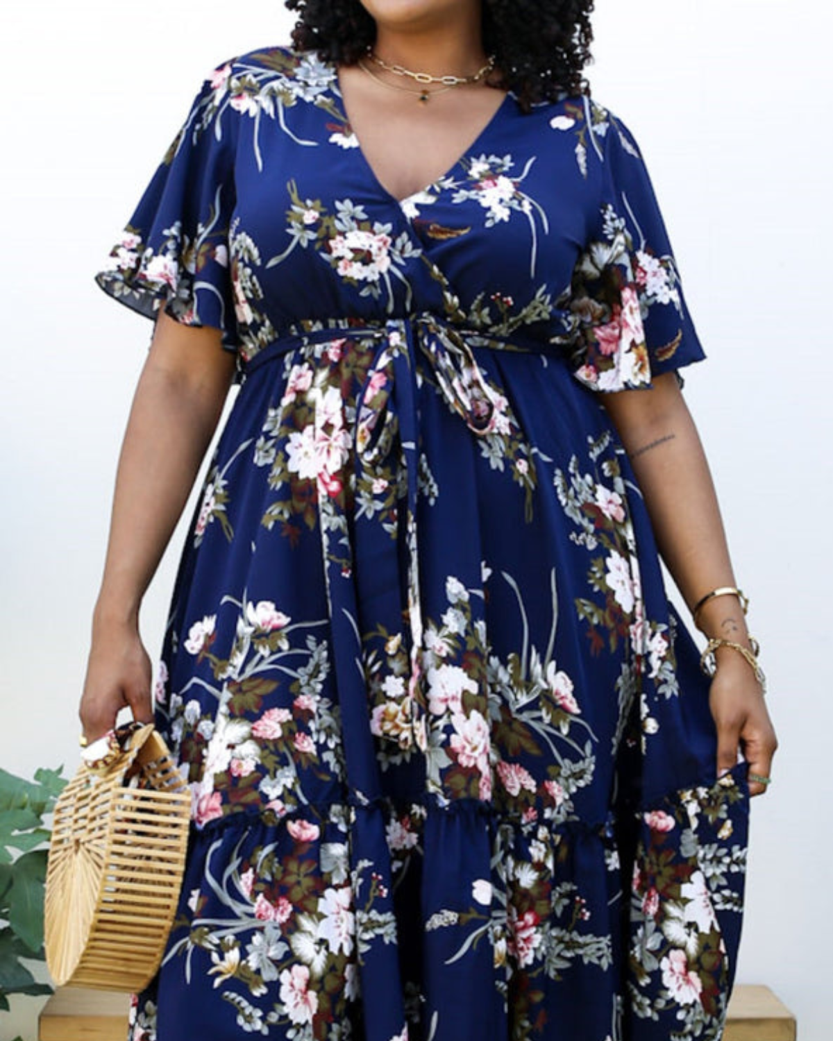 Plus Size V Neck Floral Print Flowy Navy Maxi Dress