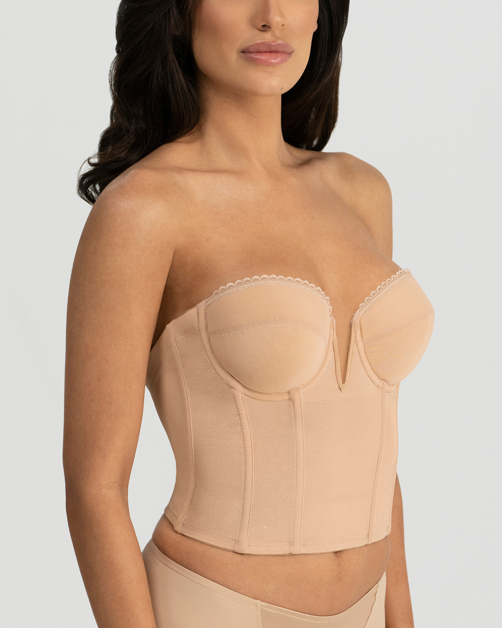 With its sheer lightweight mesh construction, and hip length, Valerie V-Wire Backless Strapless Bridal Bra combines classic styling with the newest, most luxurious fabrics, materials, and components to provide exceptional smoothing, support, shaping and comfort. Offering the lowest of the low back strapless designs with a deep plunging V-wire front, Valerie is both ultra-modern and breathable, yet sophisticated and stylish under sheer dresses or tops, and perfect for Worn-to-be-Seen. Our newest color Mocha had been an instant hit and becomes almost invisible next to most skin tones. New, modern, three-part memory foam cups hold comfortably and offer complete concealment. The super breathable cups and bodice combine with comfortable underwire support to keep you completely secure. Flexible, close-set boning shapes and smooths your curves for the perfect silhouette. Secure, padded, hook and eye rear closure.
