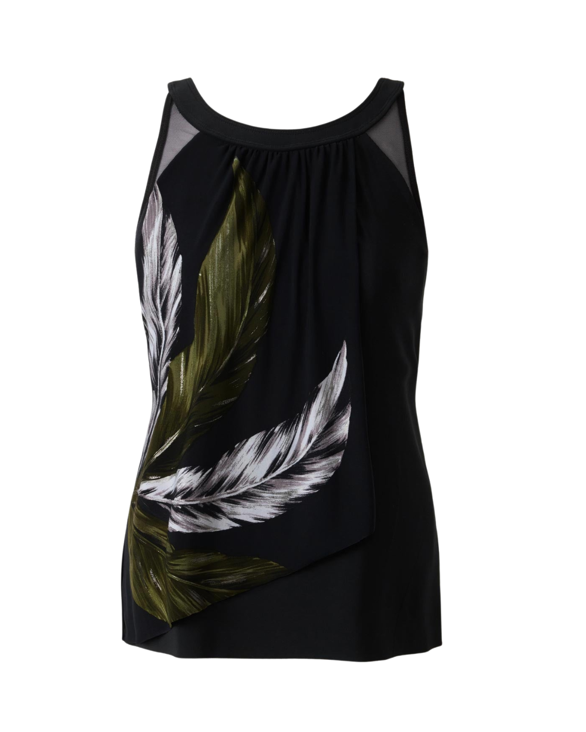 Soft faux-flyaway styling conceals the waist, while underwire support and a mesh neckline add shape and lift in this elegant tankini top. Featured in Boca Grande, an oversized palm-leaf motif in chic nori green.