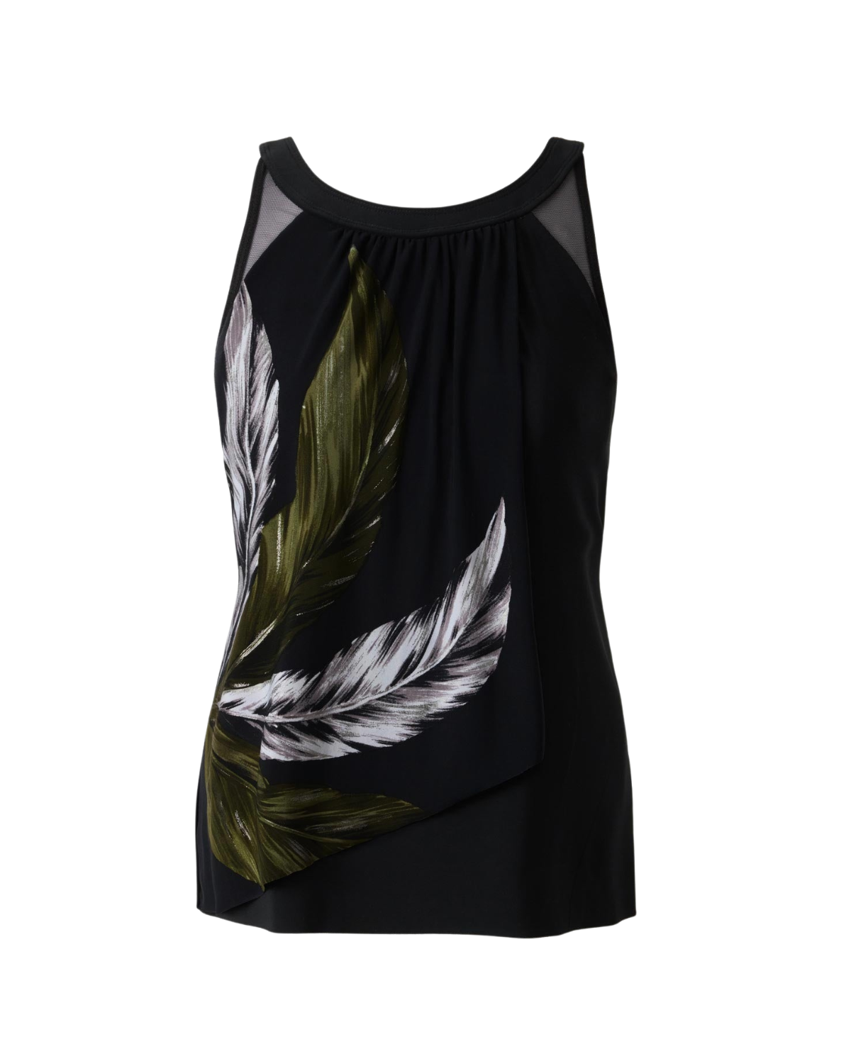 Look 10 lbs lighter in 10 seconds®. Soft faux-flyaway styling conceals the waist, while underwire support and a mesh neckline add shape and lift in this elegant tankini top.
