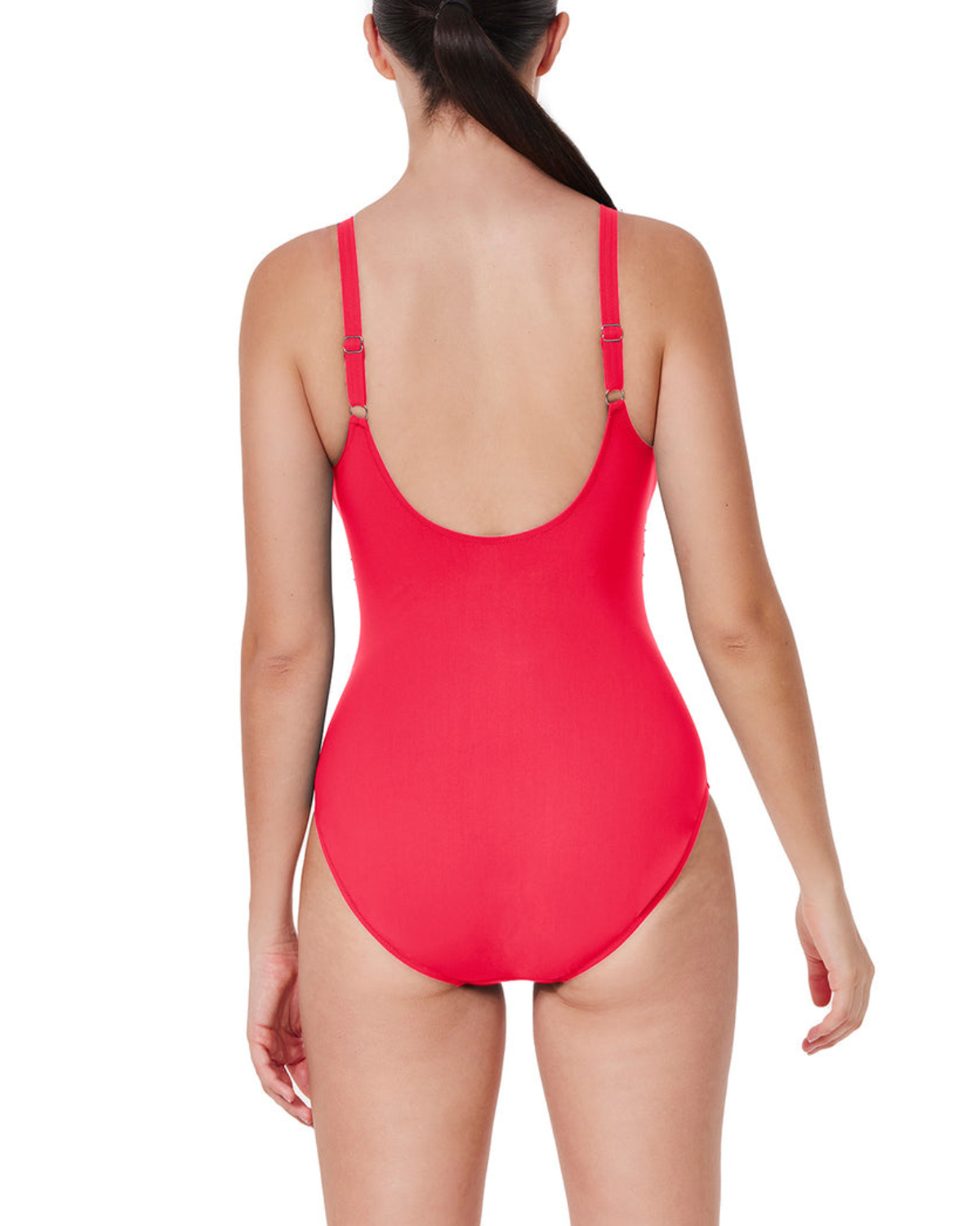 Make a statement in the Tutti Frutti D-Cup V-Neck Gold Beaded One Piece. Highlighted by elegant gold beaded ladder detail and built-in soft cups, it offers adjustable straps, tummy control, and full lining for a flattering fit and timeless coverage.