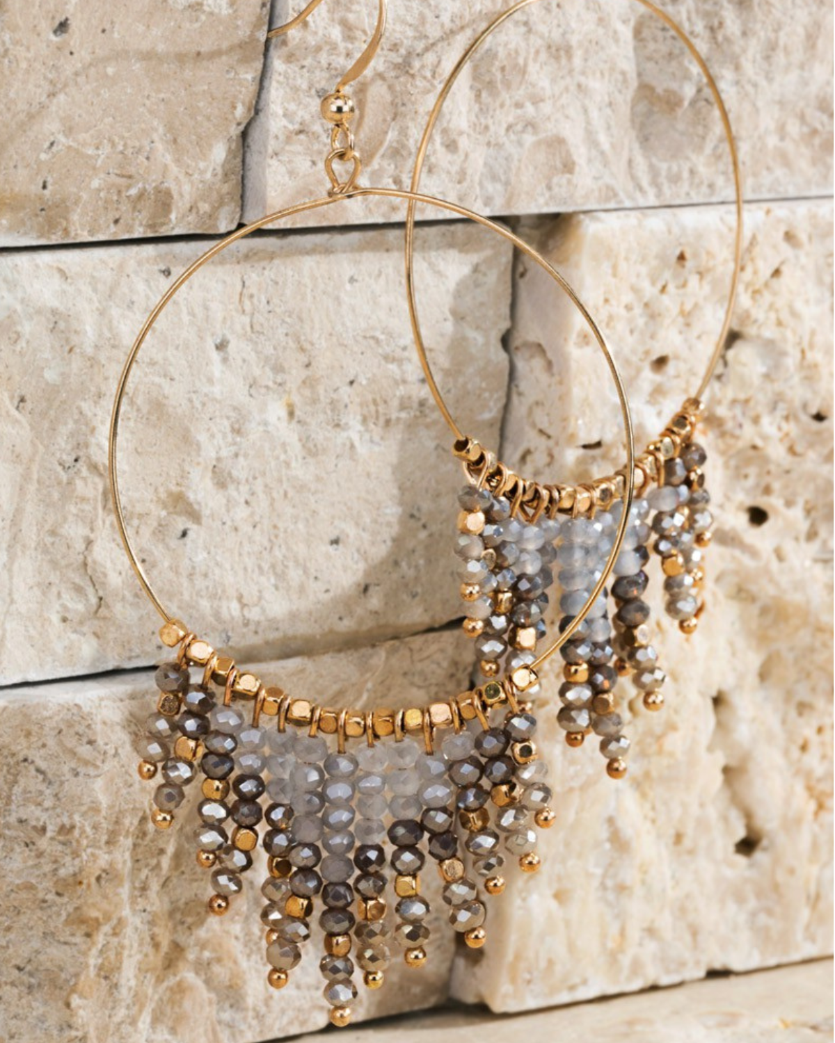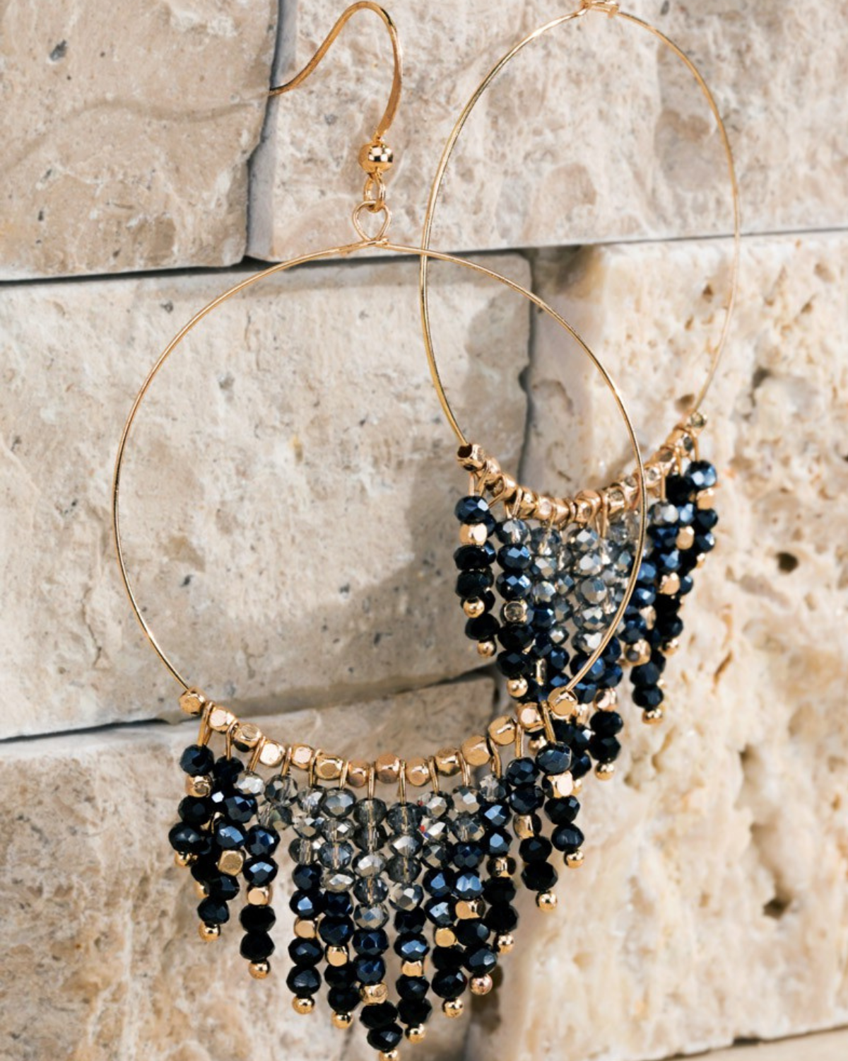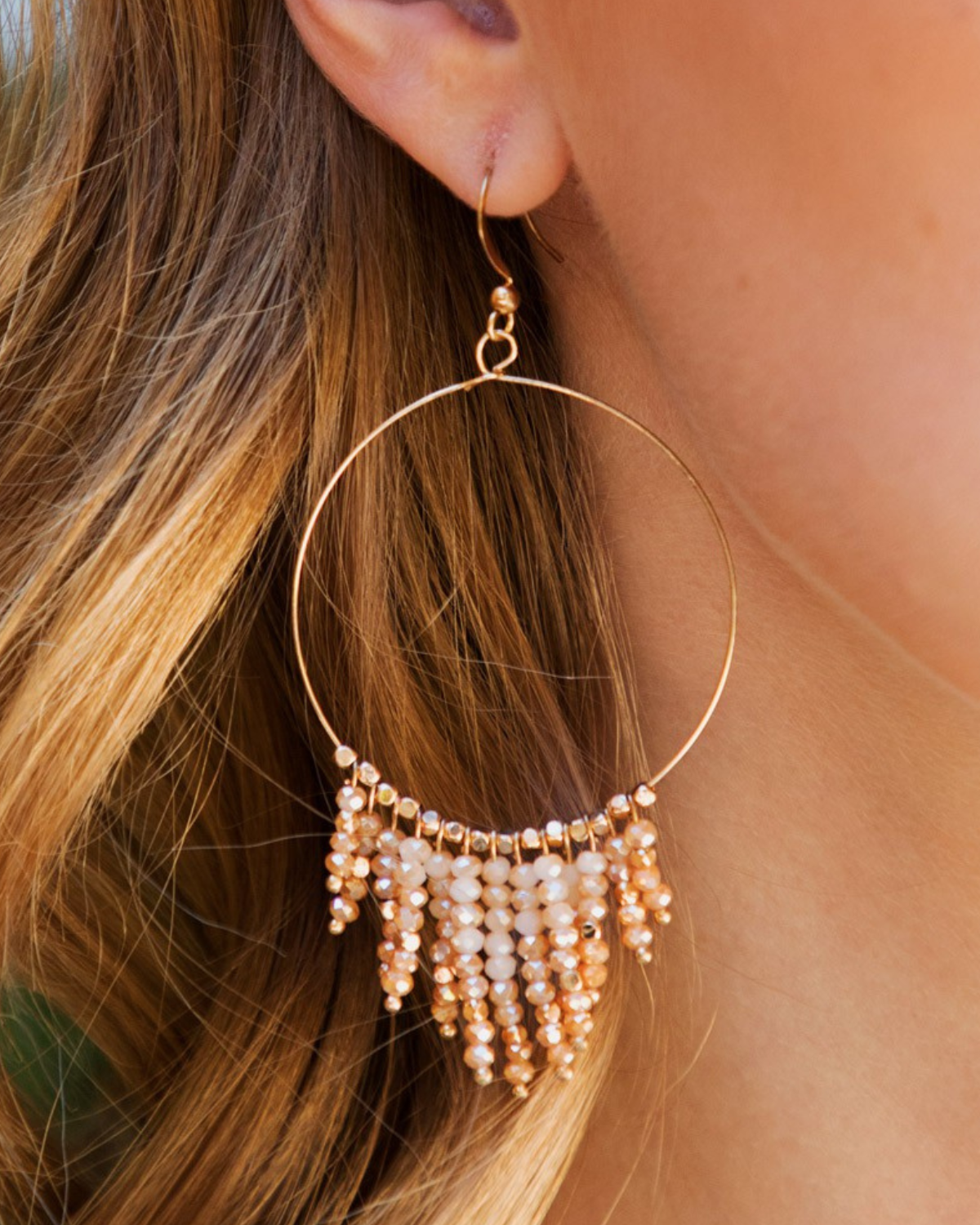 - Shimmering glass beaded tassel chandelier with metal ring fish hook earrings